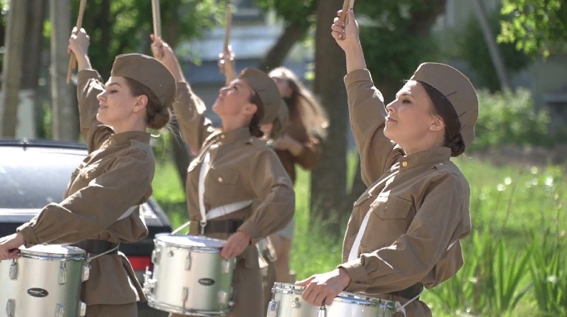 Днем во дворе дома 44 по улице Космонавтов зазвучали песни военных лет - «Катюша», «Смуглянка», «Эх, путь дорожка фронтовая», «Три танкиста» и, конечно же «День Победы» - в честь Зильберкан Людмилы Ивановны, которая в годы войны, будучи ребенком, попала в концлагерь.