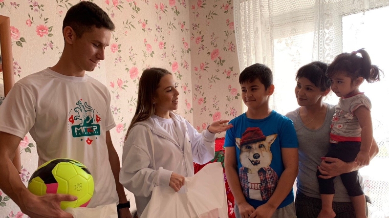 Рузиева Парвина в одиночку воспитывает двоих детей 11-летнего Самандара и 3-летнюю Амину. Молодогвардейцы приобрели и подарили Самандару школьный портфель, полный комплект формы для занятий футболом и футбольный мяч, а маленькой Амине игрушку, о которой она так долго мечтала - большая кукла.