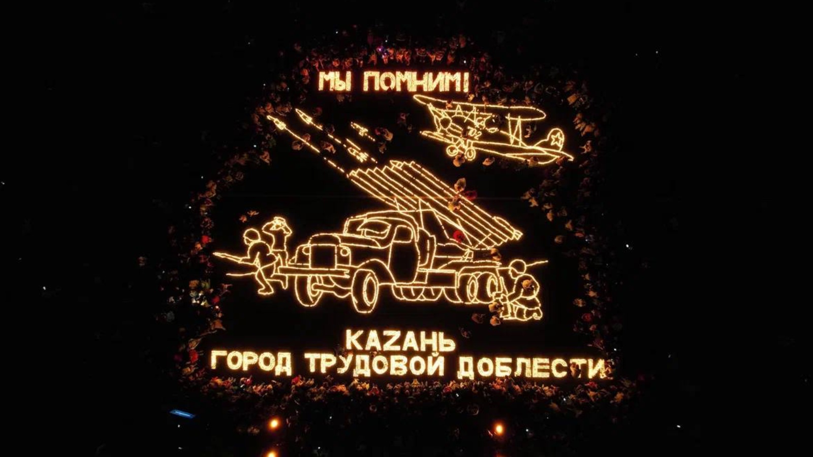 В Казани сегодня прошла ежегодная международная акция «Огненные картины войны», приуроченная ко дню памяти и скорби 22 июня. Из 20 тыс. свечей молодежные активисты выложили изображение советских солдат, «Катюши» и бомбардировщика «По-2», который во время Великой Отечественной войны производился в Казани.