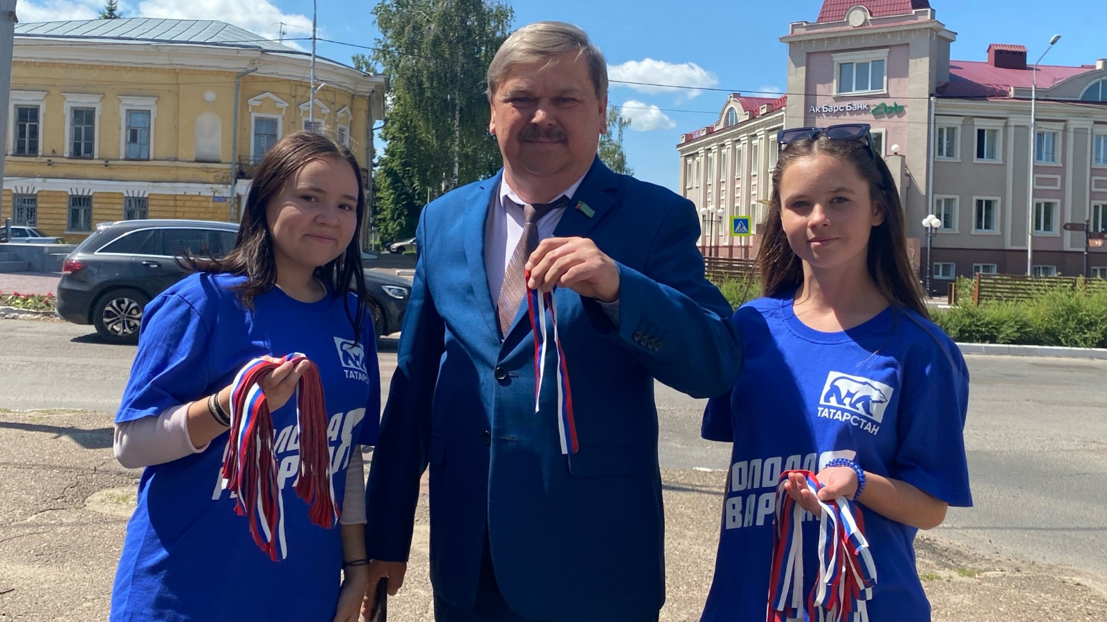 Молодогвардейцы Чистопольского района поздравили жителей города с праздником и раздали триколорные ленты с изображением флага России.