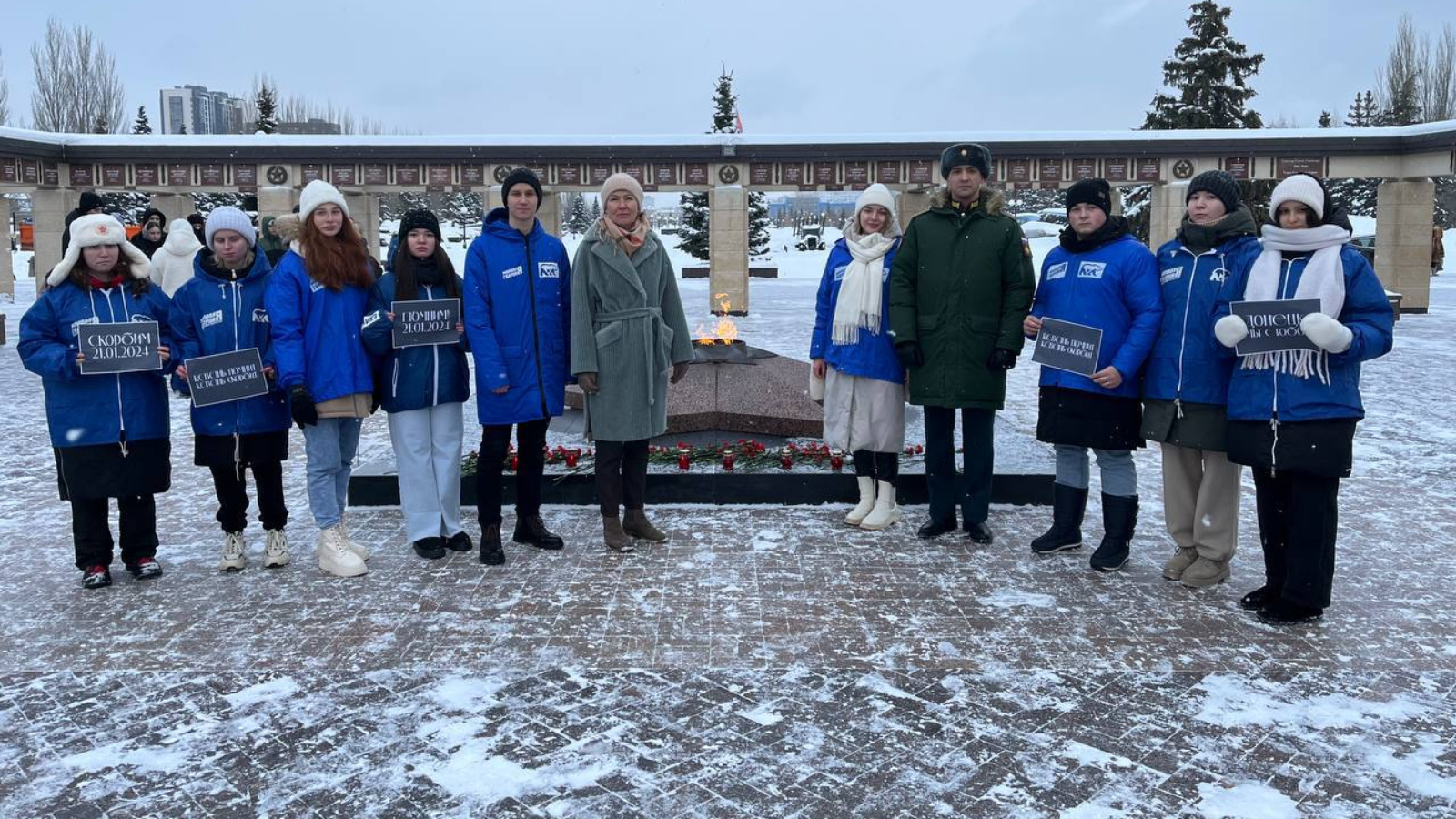 Сегодня в Парке Победы молодогвардейцы возложили цветы к вечному огню и провели минуту молчания в память о погибших в результате обстрела микрорайона Текстильщик города Донецк