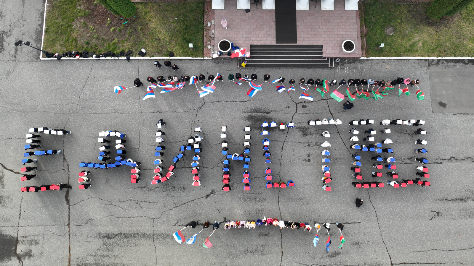 Участники флешмоба выстроились в слово «Единство» и фигуру российского триколора, держа таблички в его цветах и развевая флаги России и Татарстана. К ним присоединились представители народов России в национальных костюмах, выстроившись в линию перед фигурой.